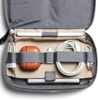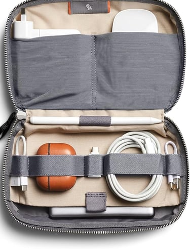 Keep must-haves — passport, charger, meds, sanitizer, lip balm, and snacks — in a separate Bellroy Tech Kit Compact you can pull out easily during check-ins or flights.